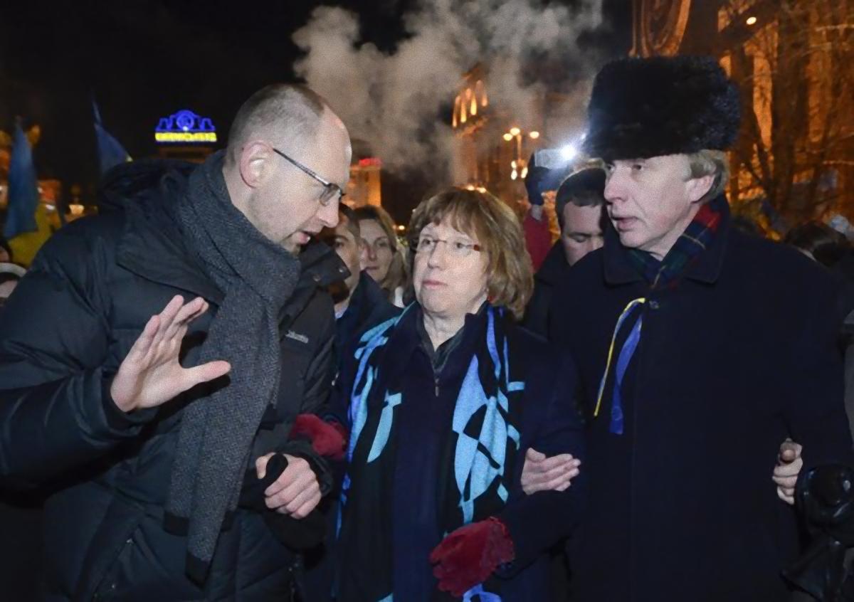 Δεν είναι μόνα αποδεικτικά στοιχεία η αυτοπρόσωπη παρουσία της τότε Υπάτης Εκπροσώπου Εξωτερικής Πολιτικής της Ε.Ε., βαρώνης Άστον (Catherine Margaret Ashton βαρώνη του Upholland και μέλος του Εργατικού Κόμματος) και του υπουργού Εξωτερικών της Γερμανίας, του σοσιαλδημοκράτη Φραντς Βάλτερ Σταϊνμάγερ, ανάμεσα σε ένοπλους διαδηλωτές, βάνδαλους και εμπρηστές, πράγμα που επιβεβαιώνει πως η Ε.Ε. δεν «αποκηρύσσει την βία απ’ όπου κι αν προέρχεται» γενικώς, αλλά μόνο όταν δεν την εγκρίνει ή δεν ευνοείται από αυτήν.
